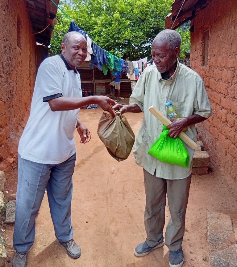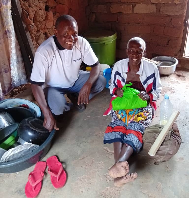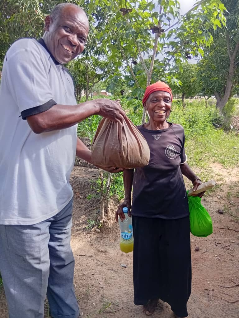 One of us who needed more help last year is Beatus Chundu, a man in his 70s [photo below]. We noticed him 3 years ago because he could only buy half a kilo of cornmeal in the shop (his only food for 3 days – after he gradually sold a piece of clothing or household item in front of the shop each time…). Since we supported him with a monthly basic food package, he regained his strength and showed himself to be a very lively personality with a great sense of humour and great trust in God. This year, however, he needed an operation, which we made possible for him, but he recovered very slowly and with many complications. He has now developed a hernia, but the surgeon advises against further surgery. So, he struggles, and we now visit him more than twice a week to be able to support him